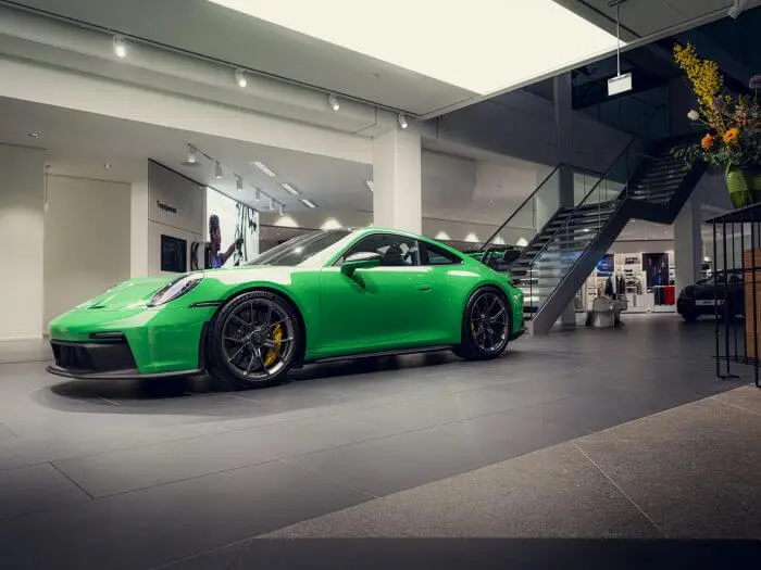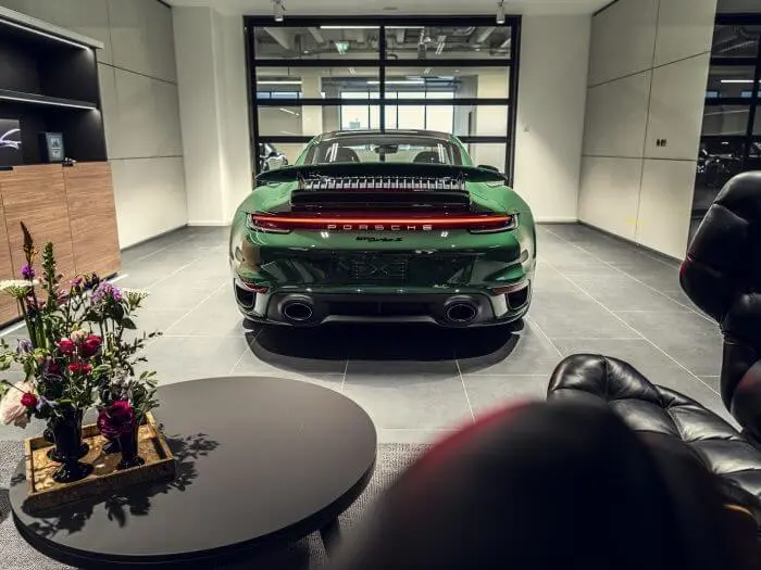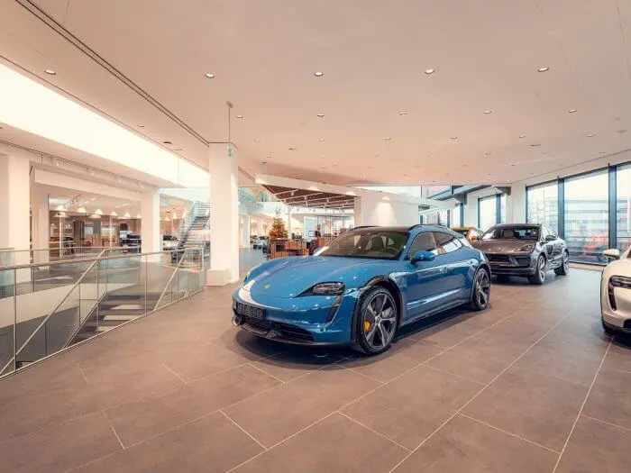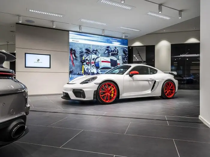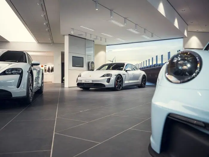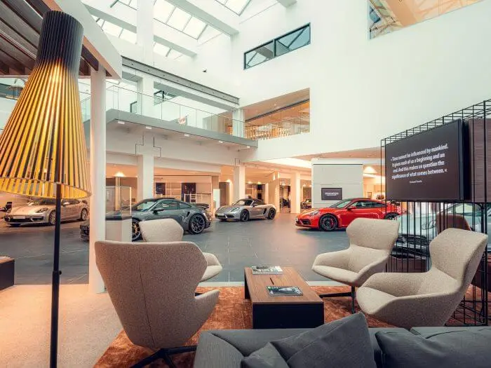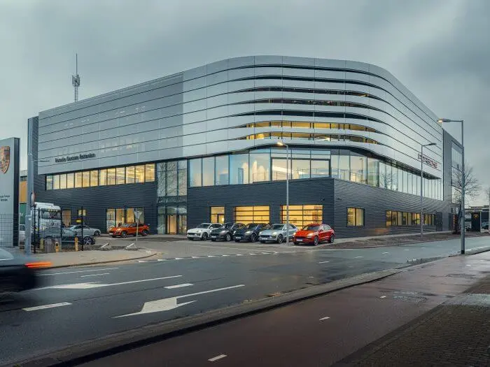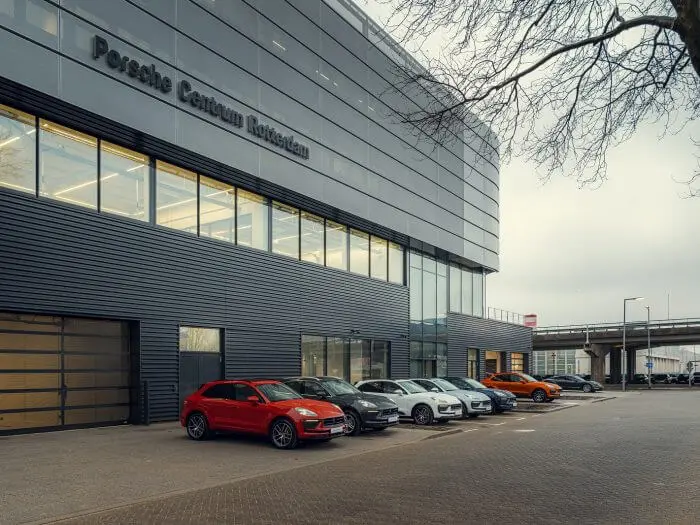 Porsche heeft een vernieuwd retailconcept gelanceerd voor zijn Porsche Centra wereldwijd en noemt dat Destination Porsche. Deze nieuwe manier van klantbenadering wordt het komende decennium geïmplementeerd bij 850 bestaande Porsche-dealers wereldwijd. Porsche Centrum Rotterdam is een van de eerste dealers die de ‘next-generation showroom’ in het nieuwe pand heeft doorgevoerd. Dat zie je al voordat je in Spaanse Polder binnenwandelt. Panelen boven de hoofdingang – samen met rode led-accentverlichting op meerdere lagen – tonen het futuristische ontwerp en weerspiegelen volgens Porsche zelfs het ontwerp van hun auto’s zelf. De 2D-lamellen op de voorgevel doen bijvoorbeeld denken aan de beroemde grille op de achterklep van de meest iconische sportwagen van Porsche: de 911 Carrera.