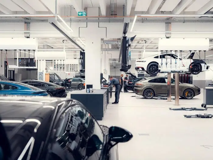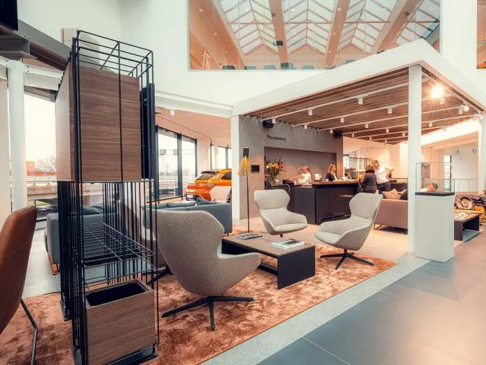 De klant staat centraal bij Porsche Centrum Rotterdam. Het open ontwerp stelt medewerkers en klanten in staat om te communiceren in een lekkere stoel in de verschillende werelden en loungeruimtes, in plaats van zich terug te trekken in kantoortjes. De Porscheplatz op de eerste verdieping van Porsche Centrum Rotterdam wordt door Tessa ‘het kloppende hart van het bedrijf’ genoemd. Je kunt hier gewoon aanschuiven en een bakkie koffie drinken dat is gezet met een Lamarzocco – de luchtgekoelde 911 onder de koffieapparaten – zonder onmiddellijk een auto te hoeven kopen. Op de tweede verdieping bevinden zich werkruimten en een lounge die kunnen worden gebruikt voor het hosten van speciale evenementen. Vanuit de serviceafdeling – op de begane vloer – kunnen bezoekers achter glas zien wat er in de werkplaats – oftewel de open keuken van Porsche – gebeurt.