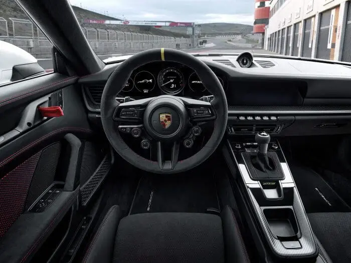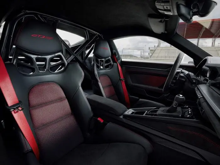 Het interieur van de nieuwe GT-sportwagen wordt gepresenteerd in de typische RS-stijl met zwart leer, Racetex en met zichtbaar carbon afgewerkte delen. De 911 GT3 RS is zonder meerprijs verkrijgbaar met een Clubsport-pakket. Dit omvat onder meer een stalen rolbeugel, een brandblusser en een zespuntsgordel voor de bestuurder. Het optionele Weissach-pakket is aanzienlijk uitgebreider. De voorklep, het dak, delen van de achtervleugel en de bovenschaal van de buitenspiegels zijn dan met zichtbaar carbon afgewerkt. De stabilisatorstangen voor en achter, de koppelstangen achter en een deel van de achteras zijn gemaakt van CFRP en dragen bij aan een verdere verbetering van de rijdynamiek. De rolbeugel van het Weissach-pakket is voor het eerst gemaakt van CFRP in plaats van staal. Dat bespaart ongeveer zes kilogram. Bij het Weissach-pakket horen ook de PDK-schakelpaddles met magneettechnologie uit de autosport. Schakelen is daardoor nog sportiever dankzij een nauwkeuriger drukpunt en een duidelijker waarneembare klik. Magnesium gesmede wielen zijn als optie verkrijgbaar bij het Weissach-pakket, waarmee acht kilogram gewicht valt te besparen.