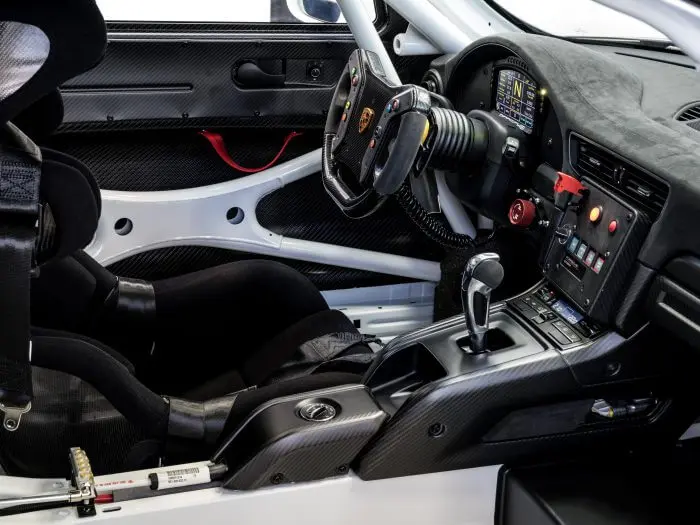 De 911 GT2 RS Clubsport heeft het carbon stuurwiel en het kleurendisplay van de 911 GT3 R. Een indrukwekkende rolbeugelconstructie zorgt samen met de racestoel en 6-punts veiligheidsgordels voor optimale veiligheid. De airconditioning koelt het interieur optimaal.