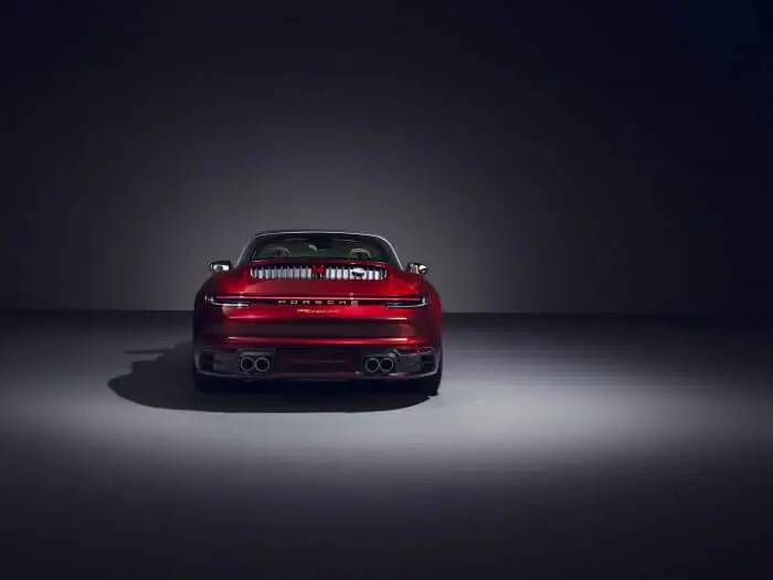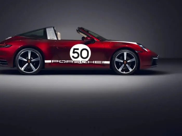 De 911 Targa 4S Heritage Design Edition laat de sfeer van de jaren ‘50 herleven met een combinatie van de Porsche Exclusive tint kersenrood metallic en goudkleurige logo’s. Naast kersenrood metallic zijn nog vier exterieurkleuren beschikbaar. Alle tinten worden gecombineerd met een stijlelement uit de beginperiode van de autosportactiviteiten van Porsche: witte speervormige accenten op de voorste wielkasten. Ook de Porsche Heritage badge op de grille van de motorkap is een blikvanger. Hij is uitgevoerd in de stijl van de emblemen die rijders van een Porsche 356 ontvingen als hun auto de mijlpaal van 100.000 kilometer had bereikt. Dit kwaliteitszegel gaat alle Porsche Heritage Design modellen sieren. De link tussen verleden en heden wordt ook duidelijk doordat de klep van de bagageruimte, het stuur, de naafkappen en de sleutels zijn uitgevoerd met het Porsche wapen uit 1963. Dit is ook verwerkt in de hoofdsteunen en op het sleuteletui. 20/21 inch Carrera Exclusive Design wielen met zwarte classic look remklauwen ronden het uiterlijk in stijl af.