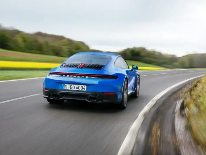 Met de nieuw vormgegeven lichtband met geïntegreerde lichtboog en ‘PORSCHE’-opschrift ziet de achterkant van de 911 er lager en breder uit. Een nieuw ontworpen achterkleprooster met vijf lamellen per zijde sluit aan op de achterruit en loopt over in de uitklapbare spoiler. Het kenteken is nu hoger geplaatst. Modelspecifieke uitlaatsystemen sluiten elegant aan op de markante diffusorvinnen. Voor de 911 Carrera-modellen is optioneel een sportuitlaatsysteem beschikbaar. Bij de 911 Carrera GTS is een specifiek voor dit model bedoelde sportuitlaat standaard. Een optioneel Aerokit-pakket omvat onder andere een opvallende SportDesign-voorbumper met frontspoiler, bijpassende sideskirts en een gewichtsbesparende vaste achtervleugel. Deze componenten zorgen voor meer neerwaartse druk en verbeteren de wegligging van de 911.